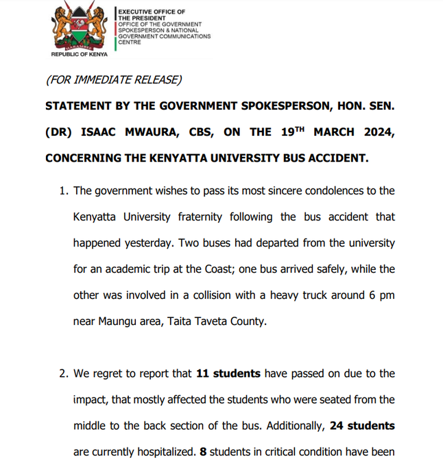 The Kenyan government has released a statement offering condolences and outlining support measures following a tragic bus accident involving Kenyatta University students.