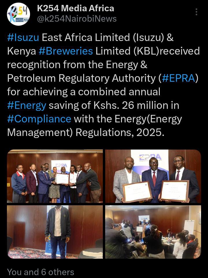 Nairobi,Kenya 29 th May 2025,Thursday - Isuzu East Africa Limited (Isuzu) and Kenya Breweries Limited (KBL) have received recognition from the Energy and Petroleum Regulatory Authority (EPRA) for achieving a combined annual energy saving of Kshs. 26 million in compliance with the Energy (Energy Management) Regulations, 2025.